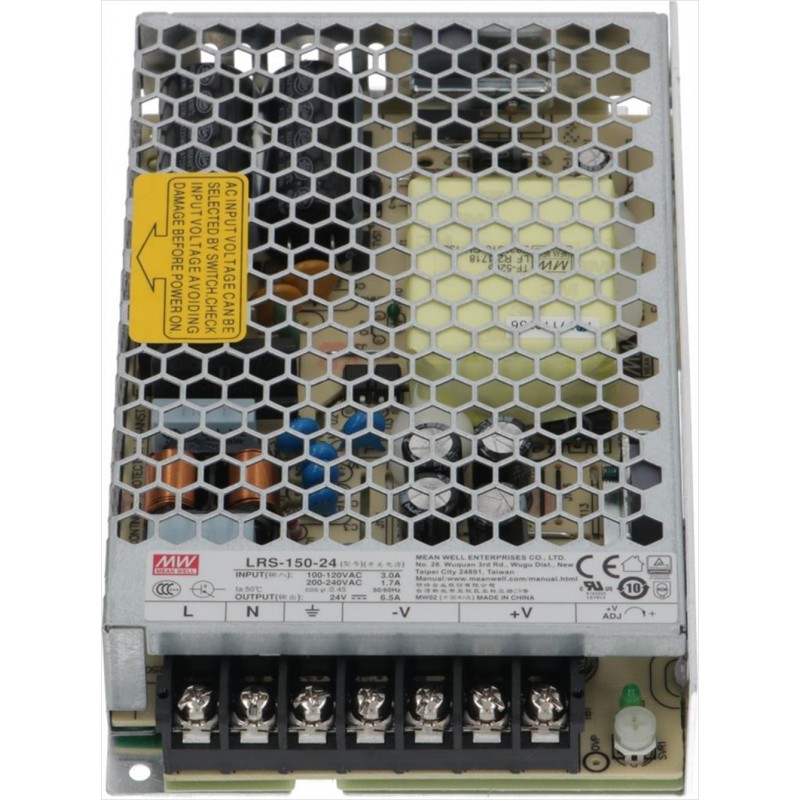 modello LRS-150-24|input: 100-120V 3,0A 50/60Hz|input: 200-240V 1,7A 50/60Hz|output: 24Vdc 6,5A|dimensioni 158x97 mm