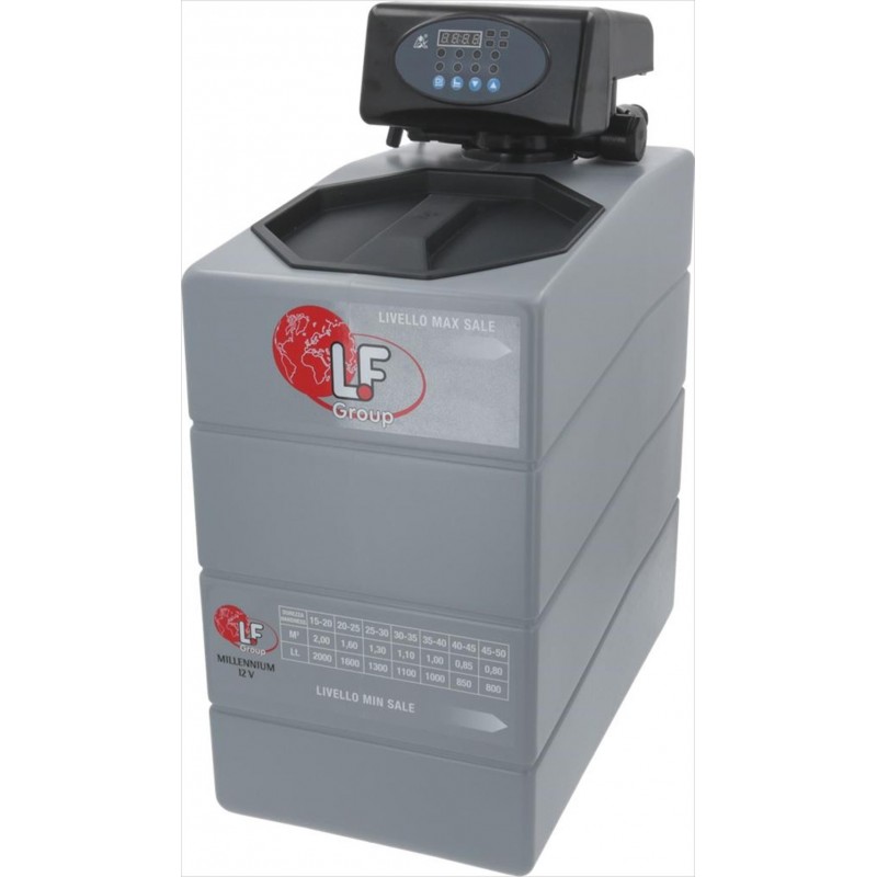 per trattamento acqua uso TECNICO|testata elettronica alimentazione 12V|regolazione cronometrica/volumetrica|con valvola galleggiante antiallagamento|attacco allacciamento idrico ø 3/4M|raccordo di scarico portagomma ø 14 mm|dimensioni: larghezza 245 mm, altezza 555 mm|profondità 530 mm|resina contenuta 9 L|sale contenuto 25 kg|sale per rigenerazione(NaCl-sale da cucina)1,3 kg|temperatura di esercizio 2°C÷35°C|pressione: min 1,5 bar - max 7 bar|portata max 1000 L/h