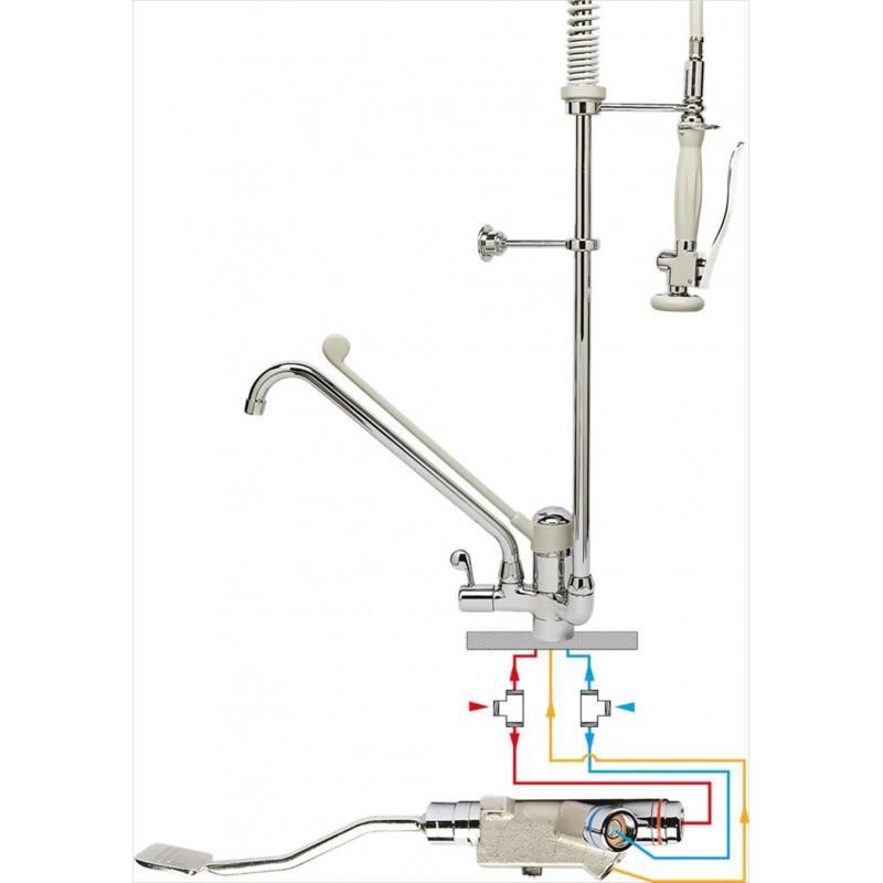 |con miscelatore monocomando|e miscelatore a pedale per montaggio sospeso|La bocca di erogazione del set|può essere alimentata con il comando a pedale|anche se la leva del monocomando è chiusa.|Canna erogazione ø 22 x 260 mm