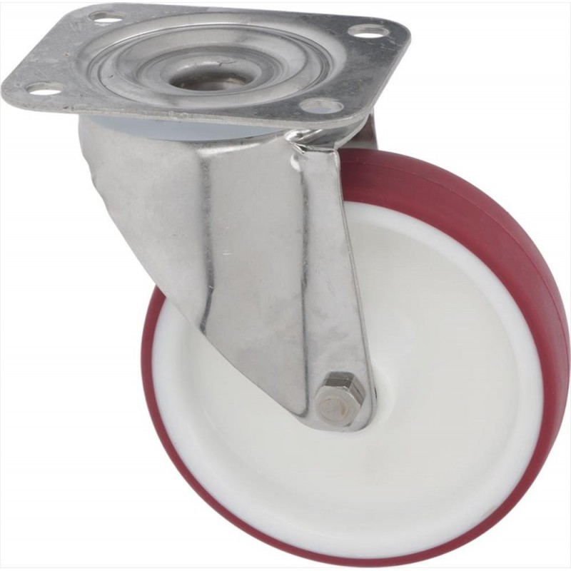 con supporti INOX - nucleo in poliammide|rivestimento in poliuretano|dimensione ø 125x32 mm - portata 150 Kg|piastra di fissaggio 105x85 mm|interasse fori 80-60 mm